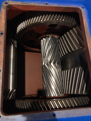 Быстроходная ступень — раздвоенный шеврон, тихоходная ступень — шевронная ступень с канавкой.